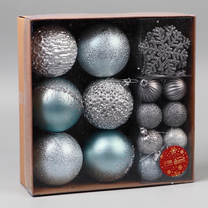 - Комплект из 30 однотонных украшений с диаметром шаров 3,5 и 7 см, а также снежинкой 6,5 см.