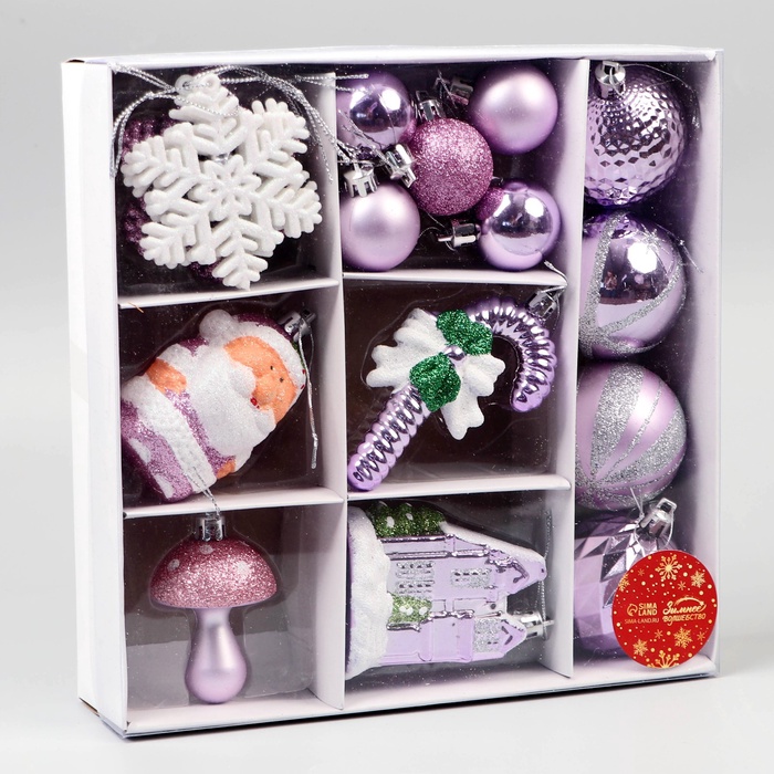 Набор из 20 однотонных пластиковых шаров в сиренево-белой гамме отражает стиль шебби-шик и подходит для создания нежного новогоднего декора. Украшения гармонично дополняют праздничную ёлку и интерьер, придавая им лёгкость и утончённость.