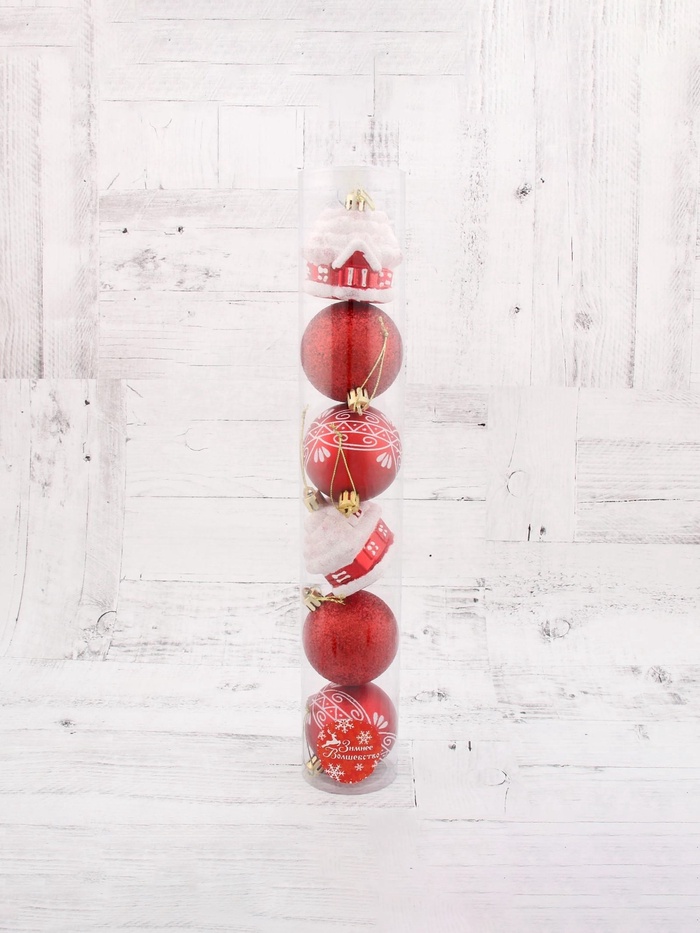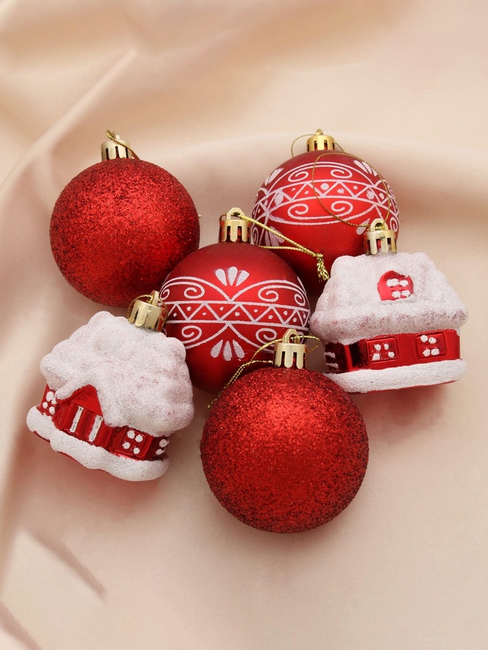 Новогодние игрушки красного цвета, 6 см в диаметре — набор из 4 шаров и 2 домиков. Это яркое решение для праздничного украшения ёлки, сочетающее классическую форму с необычными элементами. Насыщенный оттенок и разнообразие форм добавляют образу ёлки нарядности и зимнего тепла.