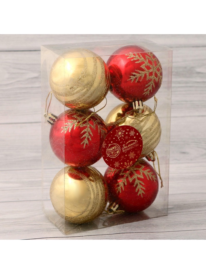 Новогодние шары «Снежная феерия ассорти» — это стильный и торжественный набор для украшения ёлки в золотисто-красной гамме. В комплекте 6 пластиковых игрушек диаметром 6 см с рисунком, выполненных в духе новогоднего барокко. Это выбор тех, кто хочет добавить празднику света, формы и зимней эстетики.