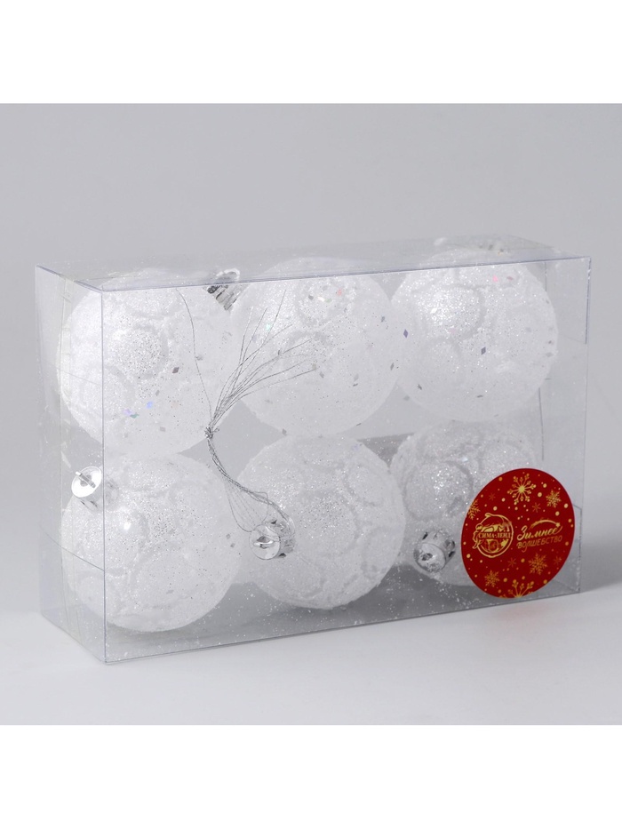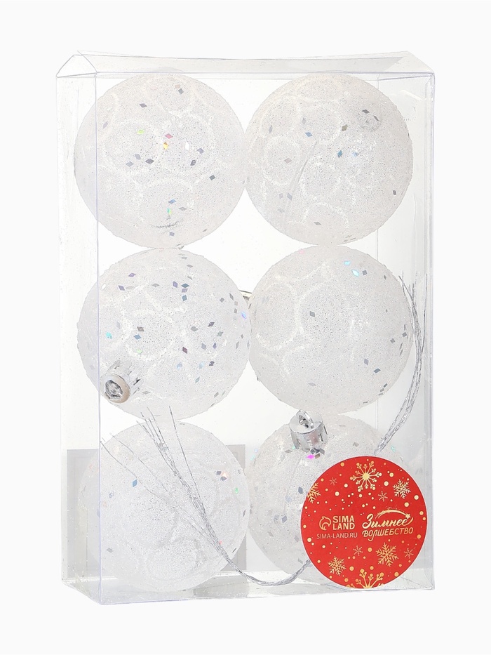 Ёлочные игрушки «Волшебство», шары новогодние, d=6 см, 6 шт., белый очаровательно смотрятся с новогодними игрушками в виде бантов и цветов. Создайте особенный новогодний интерьер в белом цвете.
