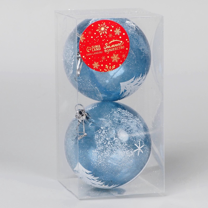 Набор из двух голубых ёлочных шаров диаметром 8 см с изящным рисунком отражает сочетание шебби-шик и советской эстетики. Пластиковые украшения добавляют нежности и винтажного настроения в новогодний декор.