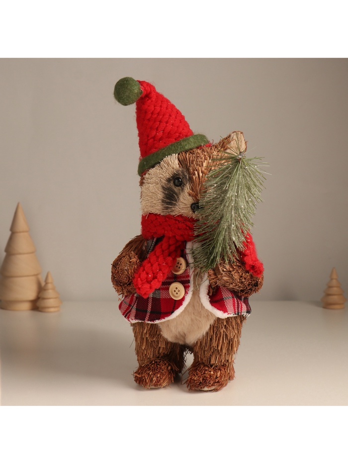 Праздничный енот в костюме станет очаровательным центром новогоднего декора. Его образ, сочетающий текстильный колпак и ёлочку, создаёт тёплую и радостную атмосферу в стиле новогоднего барокко. Эта детально проработанная фигурка привнесёт в ваш дом уют и волшебство зимних праздников.