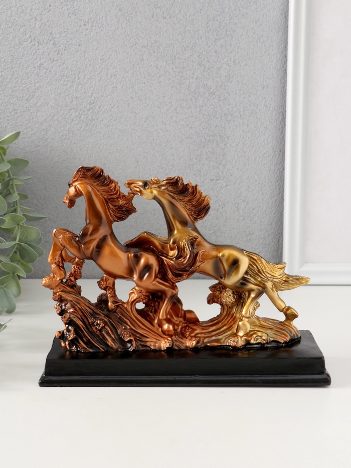 Декоративная композиция с изображением скачущих лошадей в бронзовом оттенке станет выразительным акцентом в интерьере и оригинальным подарком для любого случая. Образ динамики и силы, запечатлённый в статуэтке, подчёркивает единство природной энергии и изящества форм.