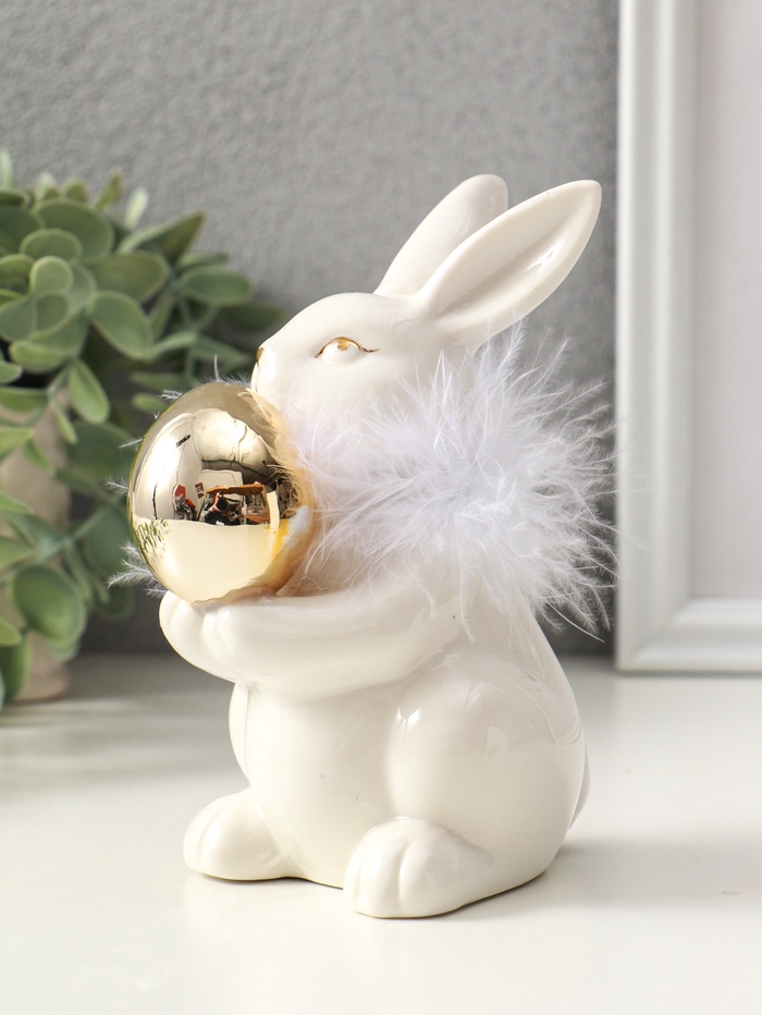 Эта белая керамическая фигурка зайки с пасхальным яйцом создаёт в доме атмосферу светлого праздника и нежного уюта. Образ трогательного кролика с золотым яичком в лапках станет символом весеннего обновления и тепла в вашей коллекции пасхального декора.