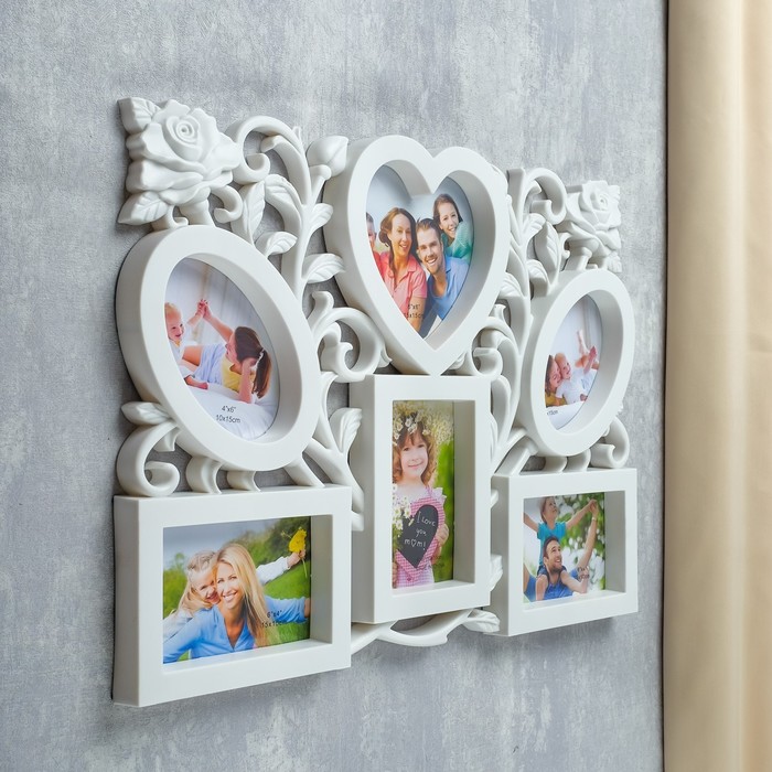 Ломаете голову над тем, что подарить своей второй половине, в День святого Валентина? Представляем Вам фоторамку-коллаж - это универсальный и неповторимый подарок, уместный для любого повода. Коллаж на стену необязательно кому-то дарить, ведь Вы можете порадовать покупкой и самого себя. Просто сделайте подборку из лучших и любимых фотографий и разместите их в фоторамках. Вы можете создать тематические серии из фото и периодически их менять. Фоторамка - коллаж на 6 фото 10×15 см, 15×15 см «Розарий», пластик, белая, 50.5×37 см - отличная возможность не ограничиваться вставкой одного фото, а разместить можно одновременно несколько дорогих сердцу снимков.