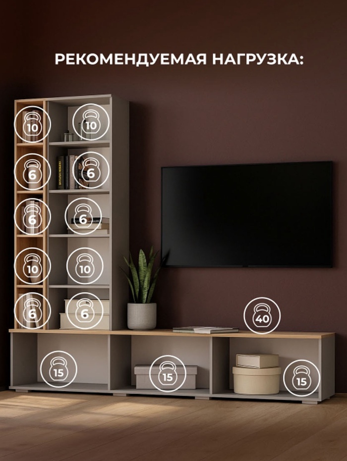 Элемент современной гостиной, сочетающий функциональность и лаконичный дизайн. Модель предназначена для организации ТВ–зоны с удобным хранением техники и сопутствующих предметов.