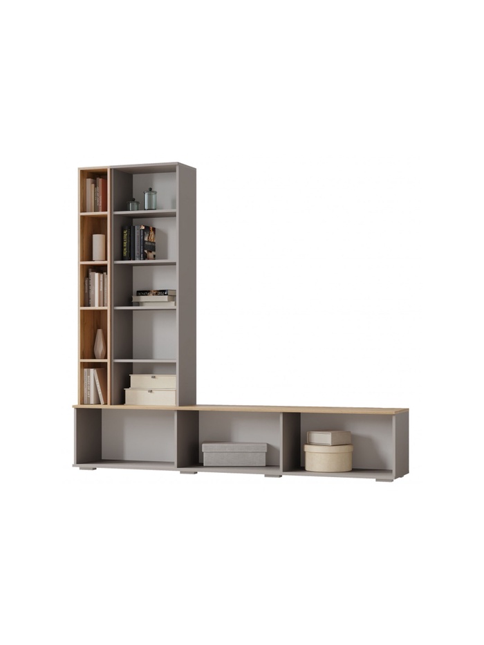 • Высокий комбинированный шкаф: закрытые отделения и открытые боковые полки для декора, книг или мультимедийных устройств.