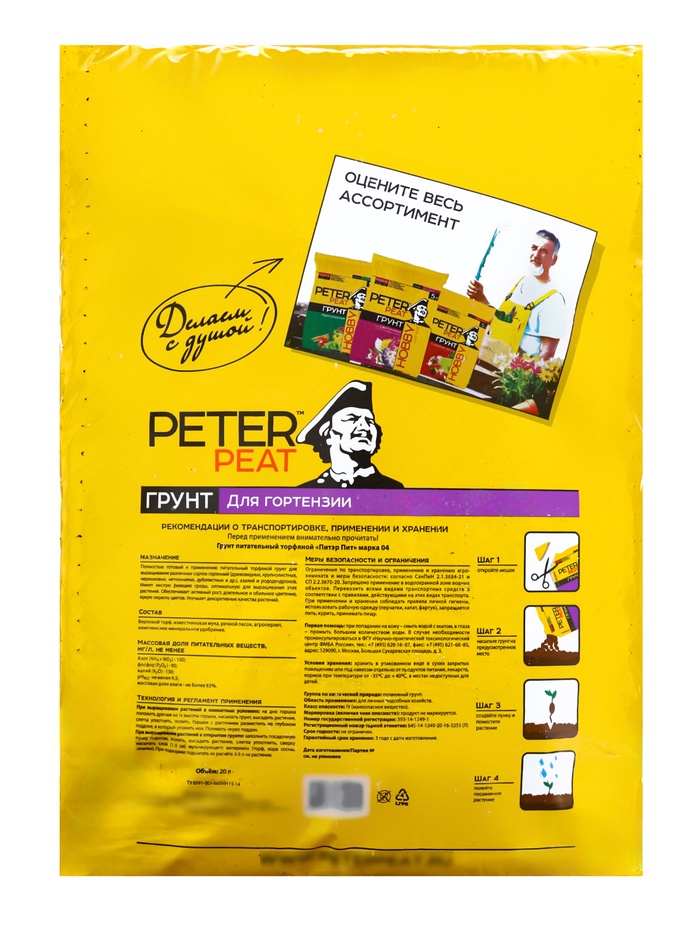 Назначение: полностью готовый к применению питательный торфяной грунт для выращивания различных сортов гортензий (древовидных, крупнолистных, черешковых, метельчатых, дуболистных и др.), азалий и рододендронов. Имеет кислую реакцию среды, оптимальную для выращивания этих растений. Обеспечивает активный рост, длительное и обильное цветение, яркую окраску цветов. Улучшает декоративные качества растений.