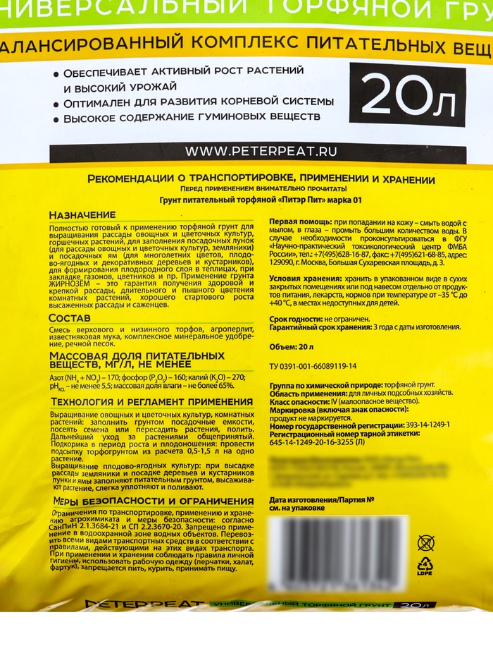 Назначение: полностью готовый к применению торфяной грунт для выращивания всех видов овощных, цветочных культур, плодовых деревьев и ягодных кустарников. Для заполнения посадочных ям и лунок, для формирования плодородного слоя в теплицах при закладке газонов, цветников и пр. Гарантирует активный рост и высокий урожай, обеспечивает развитие корневой системы, стимулирует все вегетативные процессы.