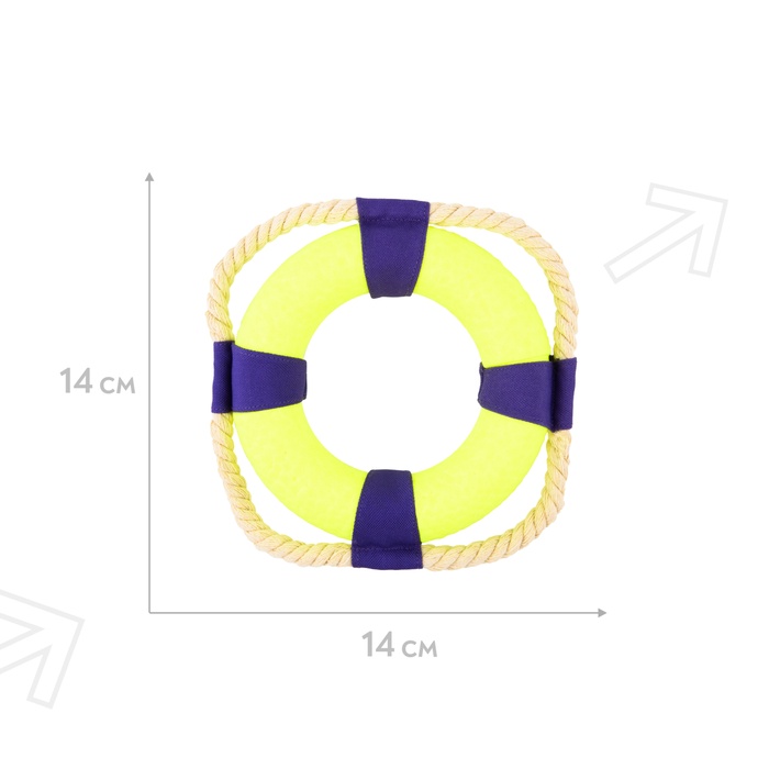 - Диаметр 14 см — для манёвренности и контроля: размер подходит большинству средних и крупных собак, не перегружая челюсти. Кольцо не слишком большое, чтобы мешать, и не слишком маленькое, чтобы теряться в лапах.