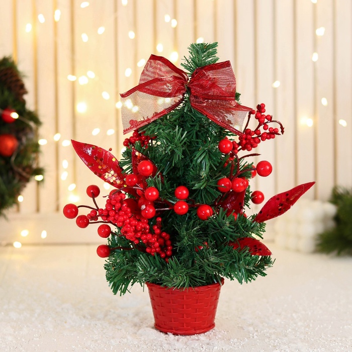 Настольная ёлка «Праздничная», 26 см, с красным декором — это доброжелательный и компактный акцент для новогоднего убранства. Искусственная модель высотой 26 см выполнена из ПВХ-веток с отгибающимся креплением, имеет зелёную хвою и украшения красного цвета — элемент декора в универсальном стиле, сочетающем ар-деко, советские мотивы и скандинавский минимализм. Подходит как для домашнего пространства, так и для офиса или подарочного оформления.