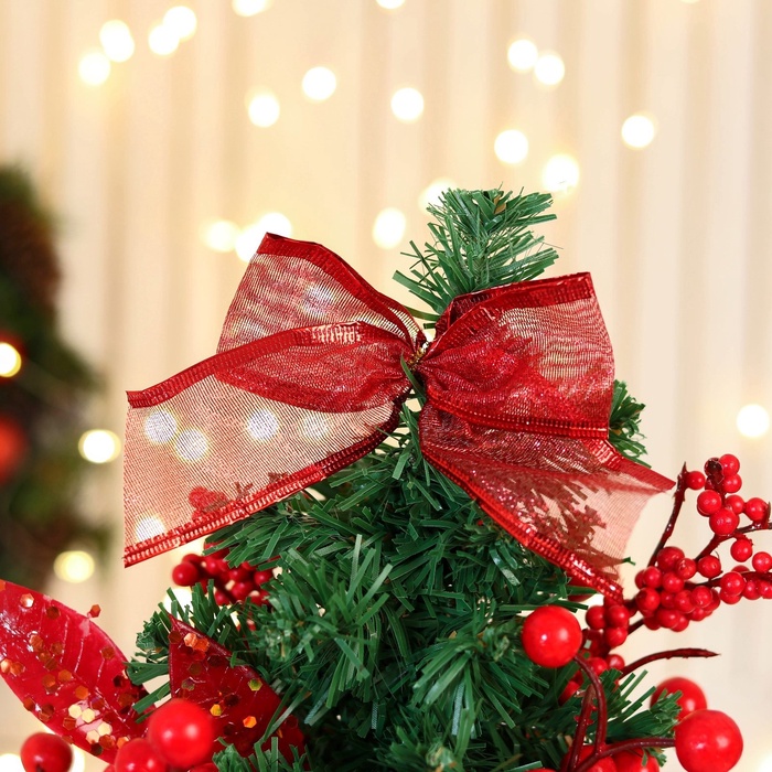 - Тип — настольная ёлка, легко помещается даже на маленьком столе или подоконнике.