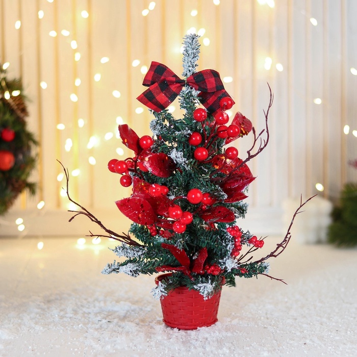 Настольная ёлка «Праздничная», 26 см, с красно-белым декором — это мягкий и доброжелательный элемент новогоднего убранства. Искусственная модель высотой 26 см выполнена из ПВХ-веток с отгибающимся креплением, имеет зелёную хвою и украшения красного и белого цветов — решение в стиле ар-деко, советского дизайна и скандинавской простоты для тех, кто ценит свет, объём и зимнюю атмосферу в мини-формате.