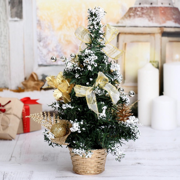Настольная ёлка «Снег», 30 см, золотой декор — это мягкий и праздничный акцент для новогоднего убранства. Искусственная модель высотой 30 см выполнена из ПВХ-веток с отгибающимся креплением, имеет зелёную хвою и украшения золотистого и белого цветов — элемент оформления в стиле ар-деко и новогоднего барокко для тех, кто ценит свет, объём и зимнюю атмосферу в мини-формате.