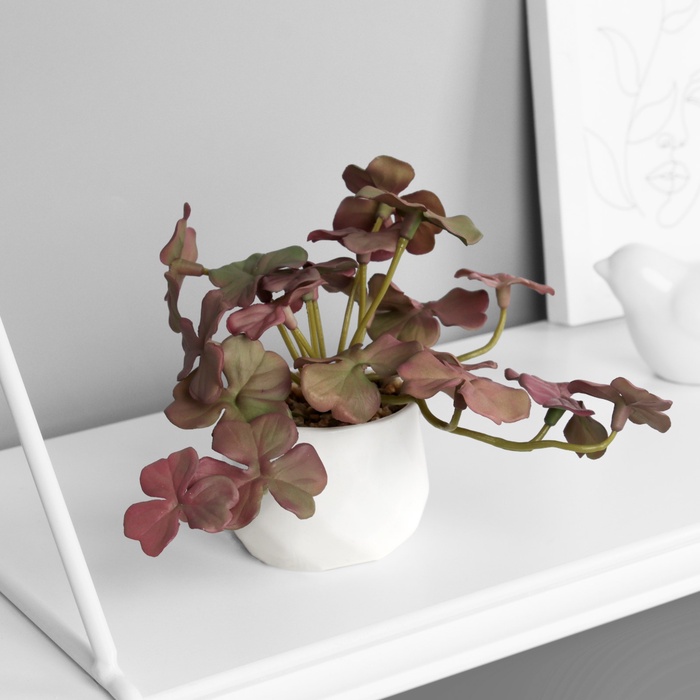 Для тех, кто ищет легкость и изящество в каждодневной обстановке, искусственный цветок в горшке станет настоящей находкой. Этот компактный декоративный элемент, высотой всего 9 см, идеально подходит для любого интерьера, от домашнего уюта до рабочего пространства. Вмещая разнообразие в своей маленькой форме, «цветочный букет» придает комнате свежесть и оживление.