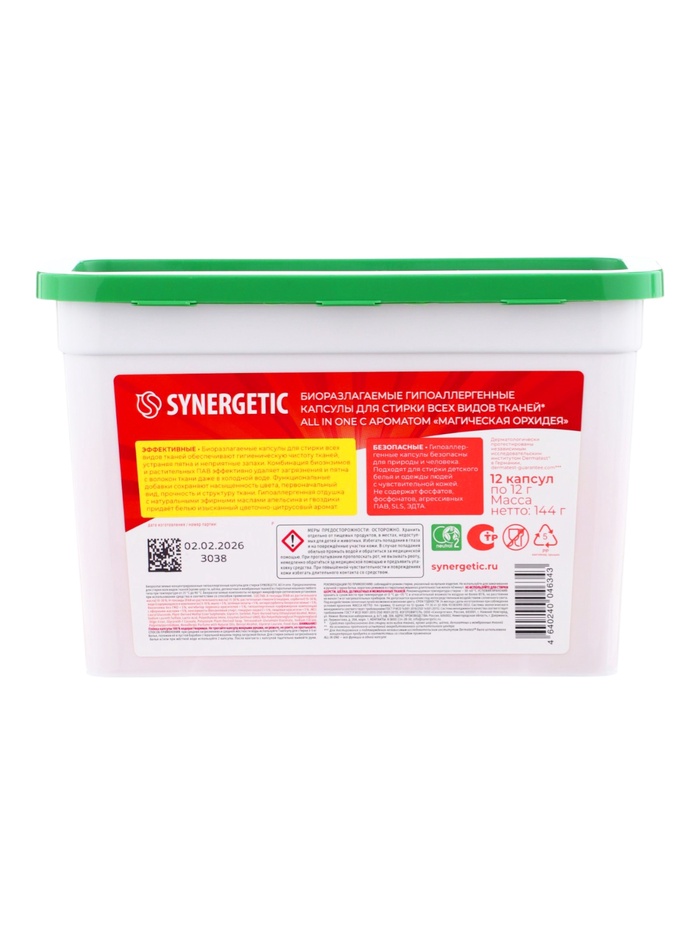 Капсулы для стирки белья биоразлагаемые SYNERGETIC ALL IN ONE гипоаллергенные, 12 шт