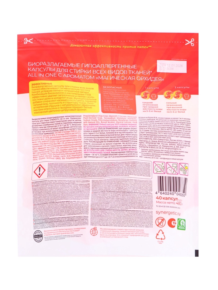 Капсулы для стирки белья биоразлагаемые SYNERGETIC ALL IN ONE гипоаллергенные, 40 шт