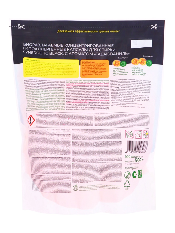Капсулы для стирки темного и цветного белья SYNERGETIC WHITE табак и ваниль, 100 шт
