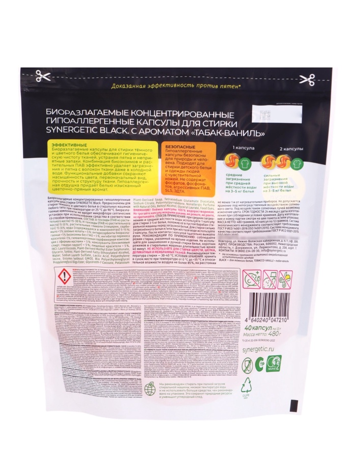 Капсулы для стирки темного и цветного белья SYNERGETIC WHITE табак и ваниль, 40 шт