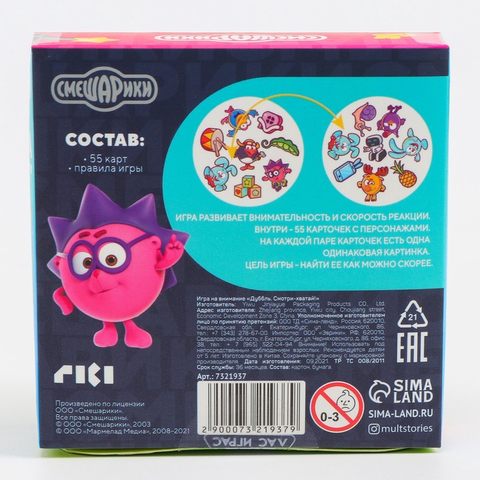 Внутри вас ждёт 55 карт с уникальным набором картинок. На каждой паре карт есть одно общее изображение. Его-то вам и нужно найти! Скорее собирайтесь всей семьёй и начинайте веселье!