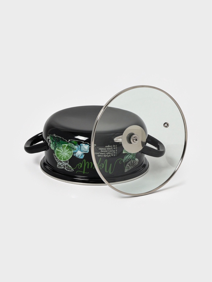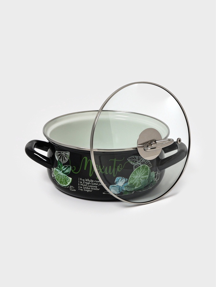 Чёрная эмалированная кастрюля с лёгким узором — для тех, кто ищет баланс между строгостью и свежестью на кухне. Эмалированная кастрюля на 2 л в чёрном цвете — это практичная посуда с характерным рисунком, вдохновлённым лёгкостью летнего «мохито».