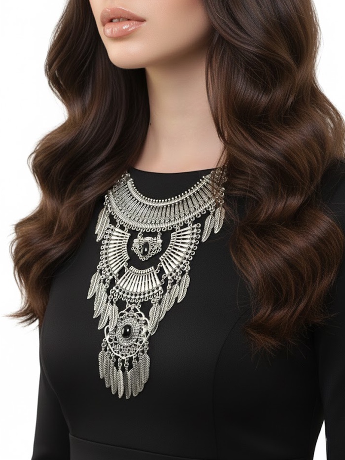 - Эталон стиля: колье располагает несколькими элементами, создающими вертикальную линию, проходящую через область ключиц и шеи, акцентирующую внимание на зоне декольте.
