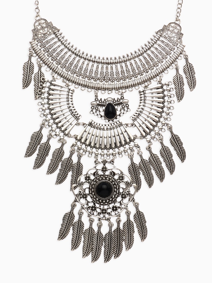 Главное преимущество колье заключается в его уникальной структуре: металлические пластины в форме перьев распределены вдоль всей длины украшения, создавая ощущение легкости и движения. Основной фон выполнен в глубоком черном цвете, покрытом чернёным серебром, что придает изделию элегантность и благородство.