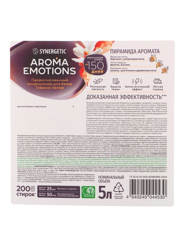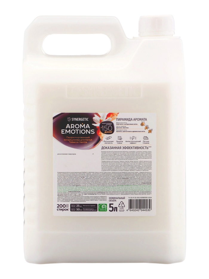 Кондиционер для белья парфюмированный SYNERGETIC ваниль, табак, бергамот, 5 л