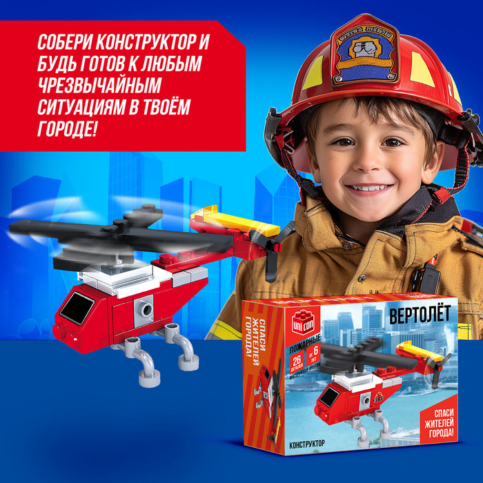 Поднимись в небо на спасательном вертолёте! Конструктор «Пожарный вертолёт» – это 26 деталей для сборки модели воздушного спасателя.