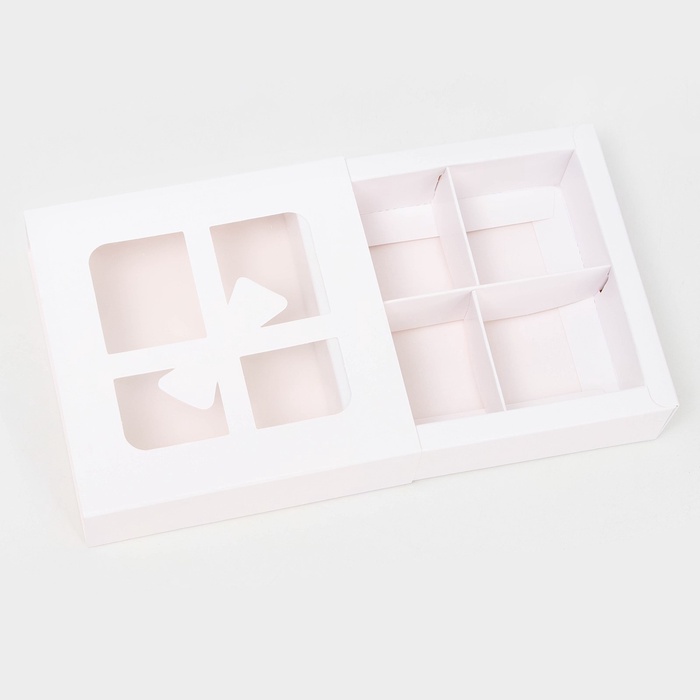 Коробка предназначена для упаковки и транспортировки четырех конфет. Она имеет достаточную вместимость для того, чтобы защитить продукты от повреждений и сохранить их свежесть.
