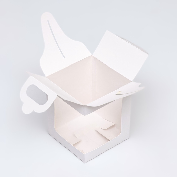 Высокая белая коробка для десертов с окном и ручкой — это упаковка для десертов с объёмным декором. Её вертикальный формат и прозрачная вставка позволяют эффектно представить торт-мороженое, капкейк с высокой шапкой или композицию из макаронс.