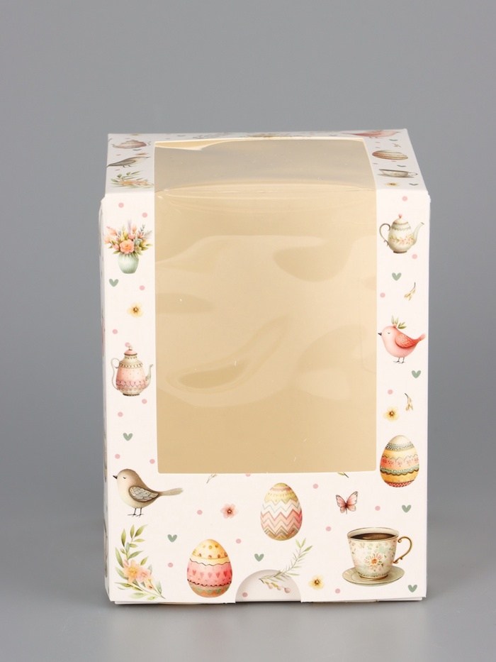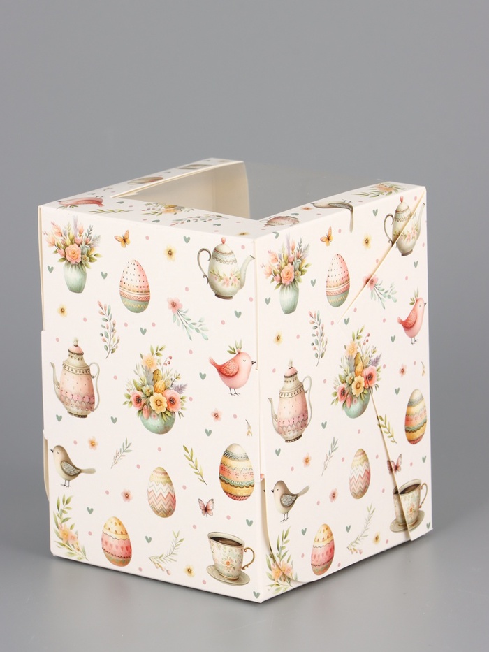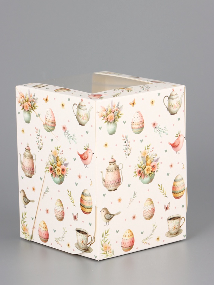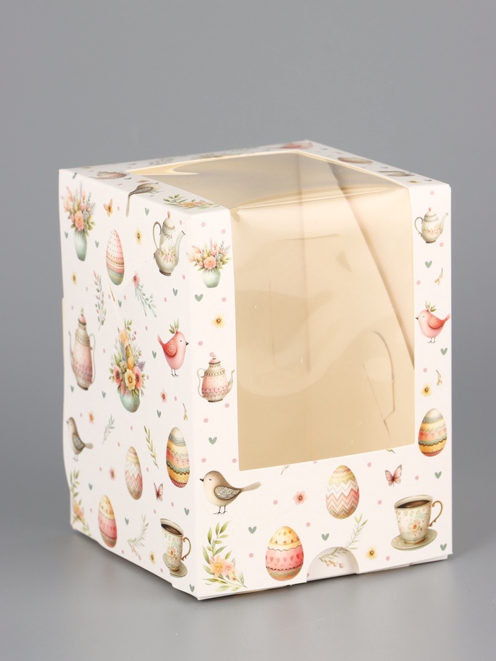 - Окно для демонстрации милого сюрприза: Прозрачная вставка позволяет показать содержимое, делая акцент на самом подарке. Это может быть пасхальное яйцо, маленький кулич, праздничный пряник или чайный набор.