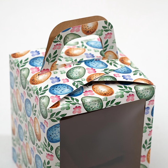 Подарок за 20 секунд: Эта коробка закрывает вопрос упаковки пасхального угощения. Кулич помещается внутрь, крышка закрывается — и набор готов к освящению или вручению. Прозрачное окно работает как витрина, а рисунок обозначает повод. В отличие от пакета, коробка не мнётся и не требует завязывания. Вы получаете готовую презентационную упаковку, где форма и декор дополняют друг друга.