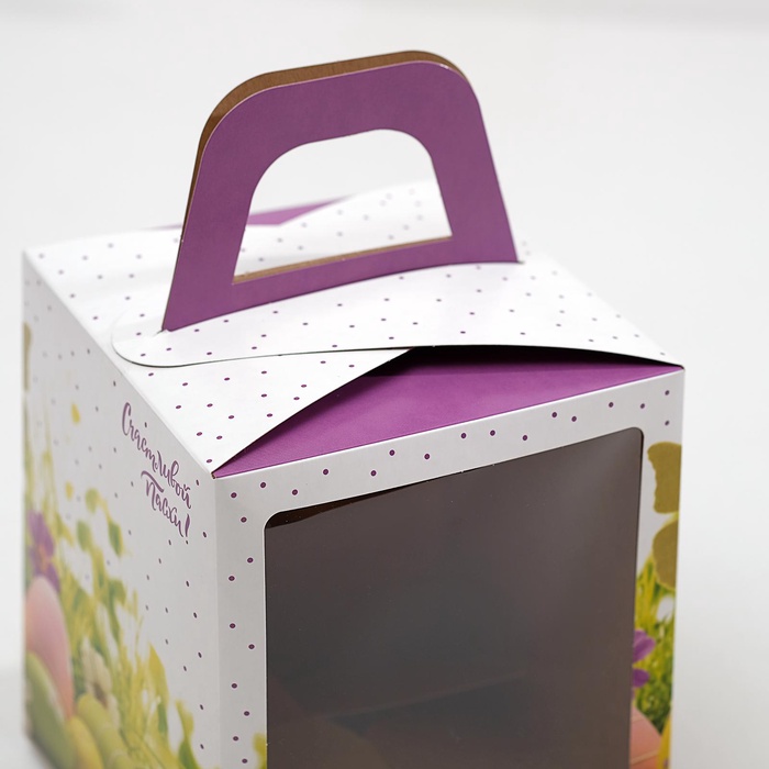 - Принт «Счастливой Пасхи!»: На стороны коробки нанесена поздравительная надпись и пасхальные символы. Рисунок расположен по периметру, не перекрывая окно. Упаковка не требует открытки или подарочного банта.