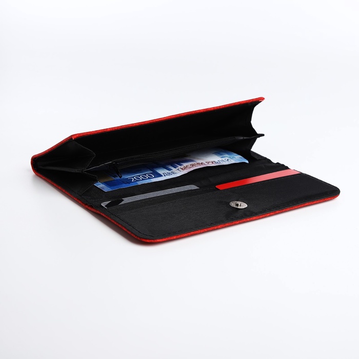 Красный женский кошелек с магнитной застежкой создает яркий акцент в повседневном образе. Увеличенный формат с тремя отделениями организует хранение карт, купюр и монет.