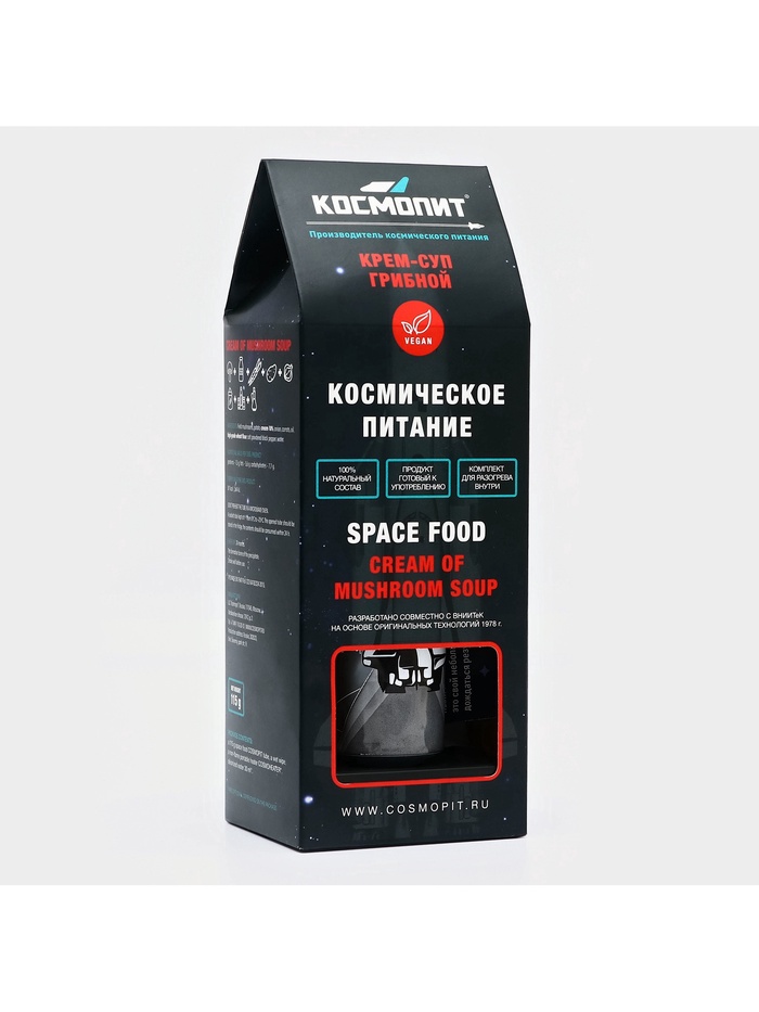 По составу экзотический грибной суп не отличается от привычного земного. Но сытное космическое блюдо в компактном алюминиевом тюбике можно взять с собой куда угодно. Упаковка, в которую помещается 165 граммов крема-супа, не боится коррозии и перепадов температуры. Она не требует холодильника. Даже если вы оставите тюбик на жаре, его герметичность не даст содержимому испортиться. Через год блюдо будет всё также готово к употреблению.