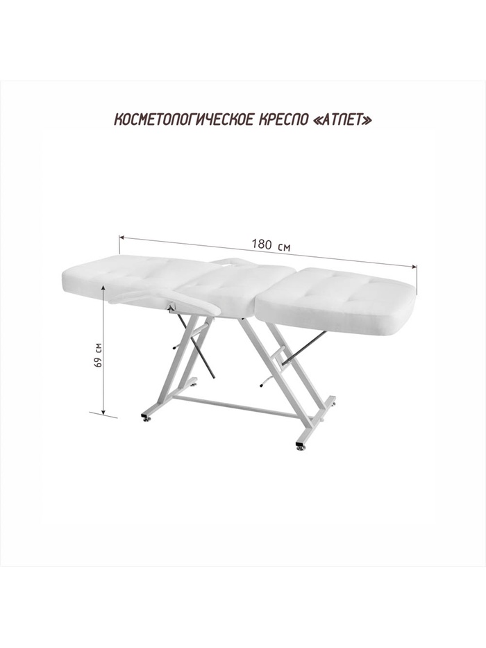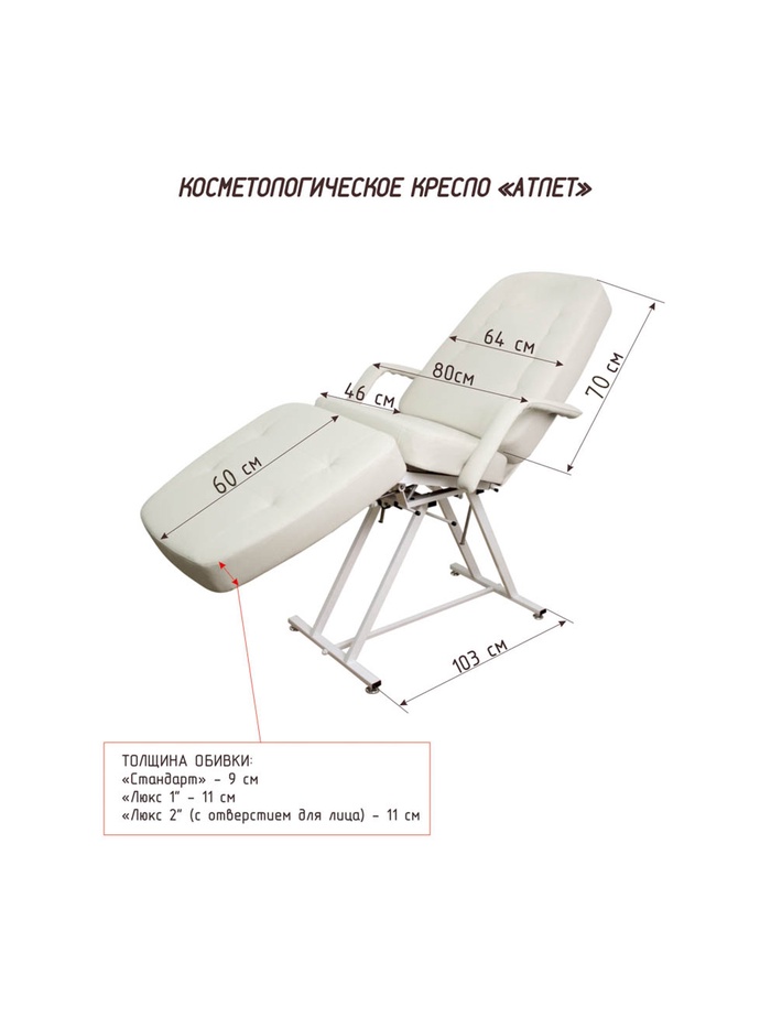 Косметологическая обивка СТАНДАРТ — обивка имеет одинаковую толщину 9 см и плотность по всей длине ложа, наполнитель специальный поролон средней жесткости. Покрытие обивки, не скользящая, высококачественная, износостойкая, «дышащая» экокожа производство Турции (50000 циклов, 100% PU полиуретан). Ширина ложа 64 см, длина 180 см. Съемные подлокотники. Косметологическое кресло «АТЛЕТ»