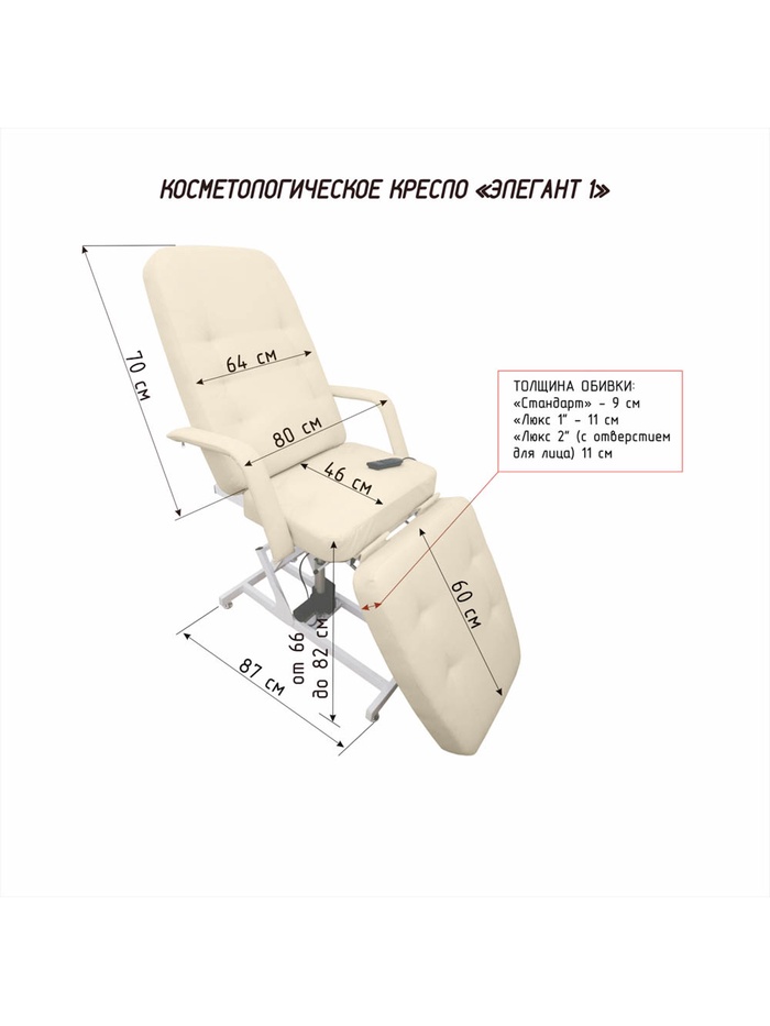 «Элегант 3» — профессиональное косметологическое кресло, созданное для мастеров, которым важны плавность регулировок, устойчивость конструкции и высокий уровень комфорта клиента.