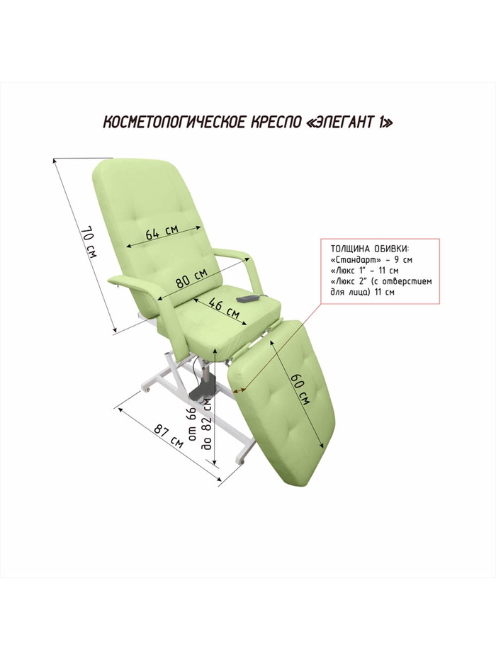 Косметологическая обивка Люкс 1 — обивка имеет одинаковую толщину 11 см и плотность по всей длине ложа, наполнитель специальный поролон средней жесткости. Покрытие обивки, матовая, не скользящая, высококачественная, износостойкая, «дышащая» экокожа производство Турция (50000 циклов, 100% PU полиуретан). Ширина ложа 64 см, длина 180 см. Съемные подлокотники.