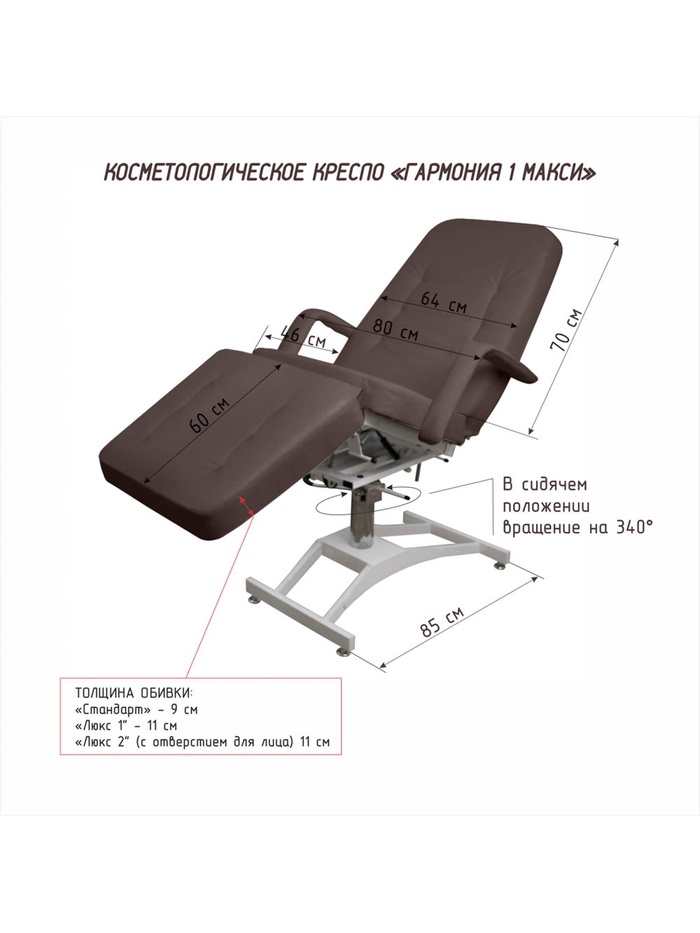 Косметологическая обивка Люкс 1 — обивка имеет одинаковую толщину 11 см и плотность по всей длине ложа, наполнитель специальный поролон средней жесткости. Покрытие обивки, матовая, не скользящая, высококачественная, износостойкая, «дышащая» экокожа производство Турция (50000 циклов, 100% PU полиуретан). Ширина ложа 64 см, длина 180 см. Съемные подлокотники. Косметологическое кресло «Гармония 1 MAXI»