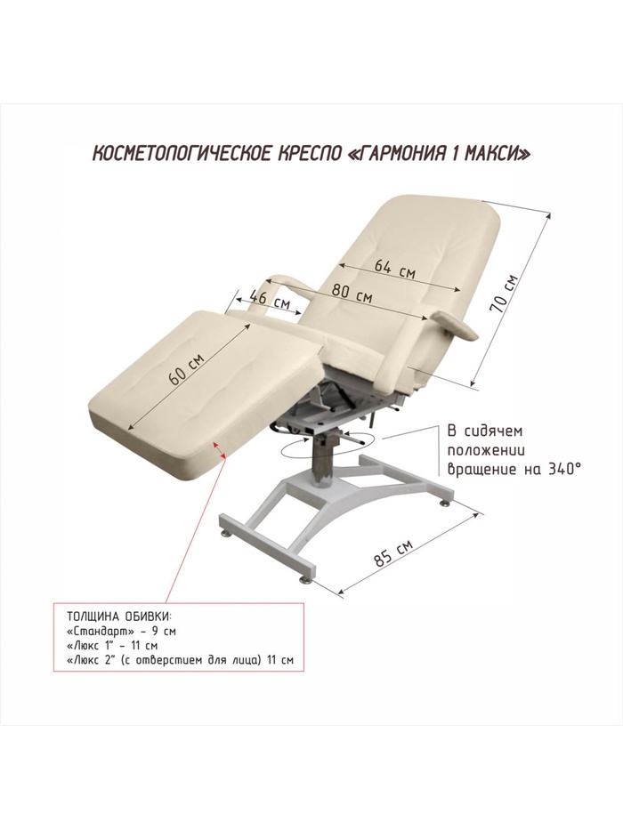 Косметологическая обивка Люкс 2 — в данной модели, в ее головной части имеется отверстие для лица (с заглушкой в комплекте). Обивка имеет увеличенную толщину 11 см и плотность по всей длине ложа, наполнитель специальный поролон средней жесткости. Покрытие обивки, матовая, не скользящая, высококачественная, износостойкая, «дышащая» экокожа производство Турции (50000 циклов, 100% PU полиуретан). Ширина ложа 64 см, длина 180 см. Съемные подлокотники. Косметологическое кресло «Гармония 1 MAXI»