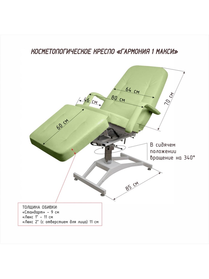 Косметологическая обивка Люкс 2 — в данной модели, в ее головной части имеется отверстие для лица (с заглушкой в комплекте). Обивка имеет увеличенную толщину 11 см и плотность по всей длине ложа, наполнитель специальный поролон средней жесткости. Покрытие обивки, матовая, не скользящая, высококачественная, износостойкая, «дышащая» экокожа производство Турции (50000 циклов, 100% PU полиуретан). Ширина ложа 64 см, длина 180 см. Съемные подлокотники. Косметологическое кресло «Гармония 1 MAXI»