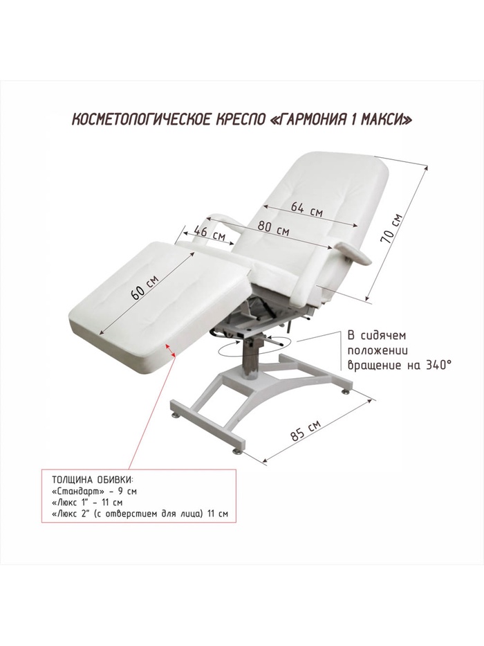 Косметологическая обивка СТАНДАРТ — обивка имеет одинаковую толщину 9 см и плотность по всей длине ложа, наполнитель специальный поролон средней жесткости. Покрытие обивки, не скользящая, высококачественная, износостойкая, «дышащая» экокожа производство Турции (50000 циклов, 100% PU полиуретан). Ширина ложа 64 см, длина 180 см. Съемные подлокотники. Косметологическое кресло «Гармония 1 MAXI»