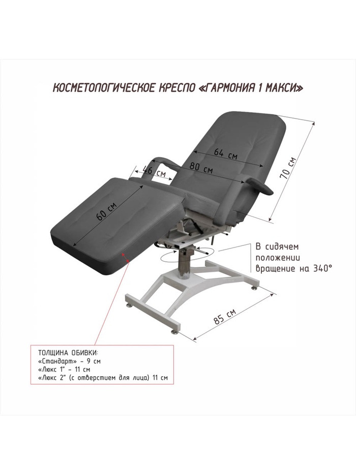Косметологическая обивка СТАНДАРТ — обивка имеет одинаковую толщину 9 см и плотность по всей длине ложа, наполнитель специальный поролон средней жесткости. Покрытие обивки, не скользящая, высококачественная, износостойкая, «дышащая» экокожа производство Турции (50000 циклов, 100% PU полиуретан). Ширина ложа 64 см, длина 180 см. Съемные подлокотники. Косметологическое кресло «Гармония 1 MAXI»
