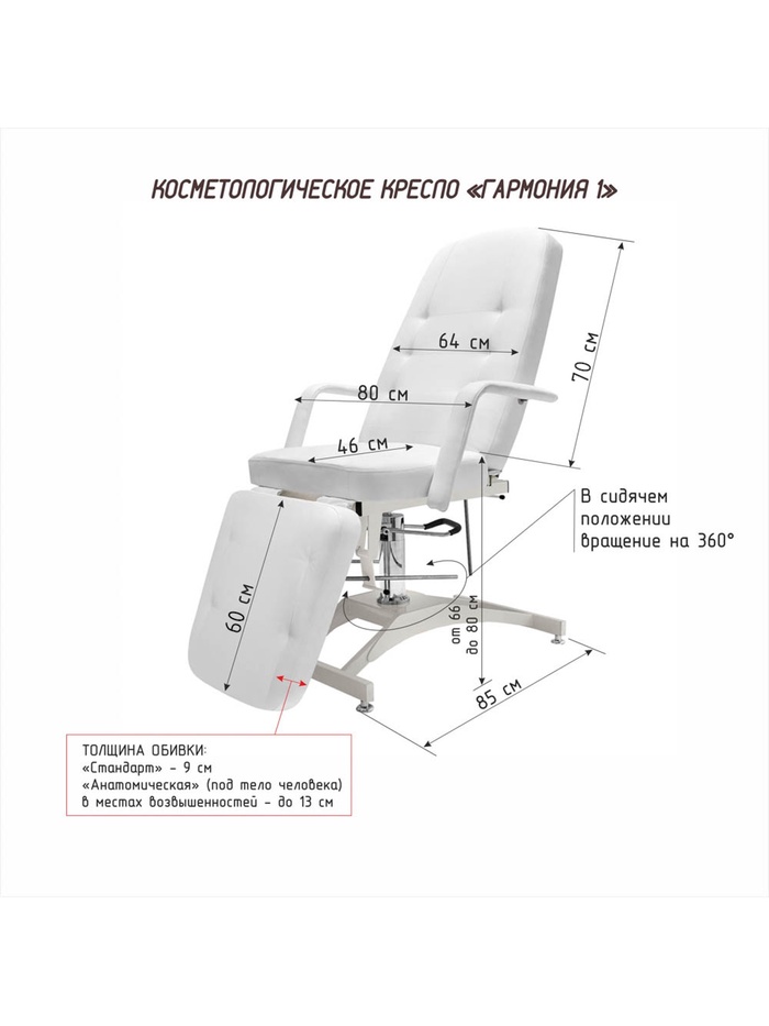 Косметологическая обивка СТАНДАРТ — обивка имеет одинаковую толщину 9 см и плотность по всей длине ложа, наполнитель специальный поролон средней жесткости. Покрытие обивки, не скользящая, высококачественная, износостойкая, «дышащая» экокожа производство Турции (50000 циклов, 100% PU полиуретан). Ширина ложа 64 см, длина 180 см. Съемные подлокотники. Косметологическое кресло «ГАРМОНИЯ 1»