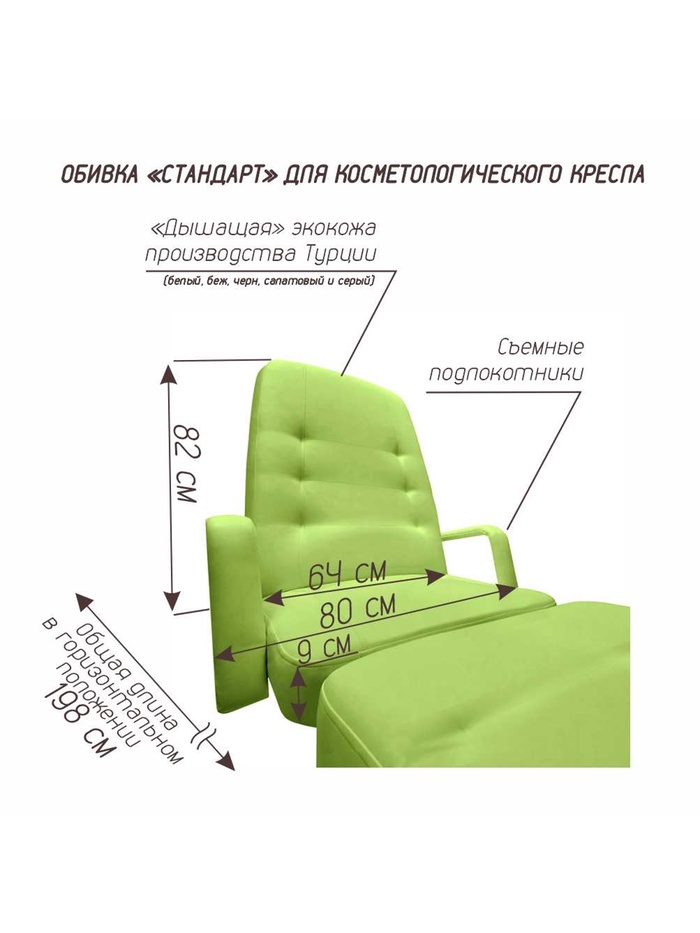 Косметологическая обивка СТАНДАРТ — обивка имеет одинаковую толщину 9 см и плотность по всей длине ложа, наполнитель специальный поролон средней жесткости. Покрытие обивки, не скользящая, высококачественная, износостойкая, «дышащая» экокожа производство Турции (50000 циклов, 100% PU полиуретан). Ширина ложа 64 см, длина 180 см. Съемные подлокотники. Косметологическое кресло «ГАРМОНИЯ 1»