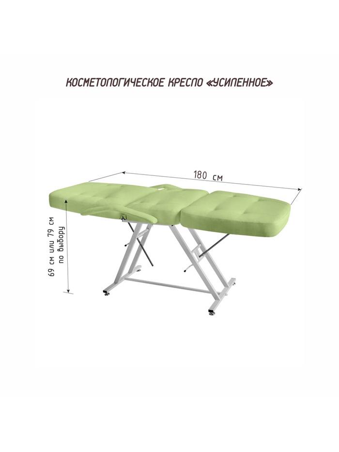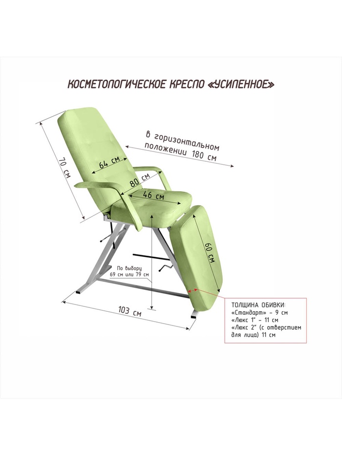 Косметологическая обивка Люкс 2 — в данной модели, в ее головной части имеется отверстие для лица (с заглушкой в комплекте). Обивка имеет увеличенную толщину 11 см и плотность по всей длине ложа, наполнитель специальный поролон средней жесткости. Покрытие обивки, матовая, не скользящая, высококачественная, износостойкая, «дышащая» экокожа производство Турции (50000 циклов, 100% PU полиуретан). Ширина ложа 64 см, длина 180 см. Съемные подлокотники. Косметологическое кресло «УСИЛЕННОЕ» Максимальная прочность. Стабильность. Профессиональный уровень. «УСИЛЕННОЕ» — это кресло, созданное для интенсивной работы и высокой нагрузки. Надёжная конструкция, продуманная механика и усиленный каркас делают его идеальным выбором для косметологических кабинетов, где важны устойчивость, безопасность и уверенность в оборудовании. Основа кресла выполнена из усиленной профильной трубы 40×20 мм — это обеспечивает повышенную жёсткость и устойчивость конструкции. Кресло выдерживает нагрузку до 220 кг, оставаясь стабильным и комфортным в работе с клиентами любой комплекции. Механическая регулировка угла наклона спинки и ножной части позволяет точно настроить положение под процедуру и клиента. Стопорные механизмы фиксируют заданный угол, обеспечивая безопасность и удобство работы. Быстросъёмные складные подлокотники упрощают посадку клиента и расширяют возможности мастера. Рабочая высота кресла — 69 см — оптимальна для комфортной посадки и стабильной работы специалиста. Металлический каркас покрыт износостойкой порошковой краской, защищающей конструкцию от повреждений и коррозии. Почему стоит выбрать «УСИЛЕННОЕ»? Это не просто кресло — это профессиональный инструмент, созданный для того, чтобы ваши клиенты чувствовали заботу, а вы — уверенность, комфорт и надёжность в каждой процедуре.
