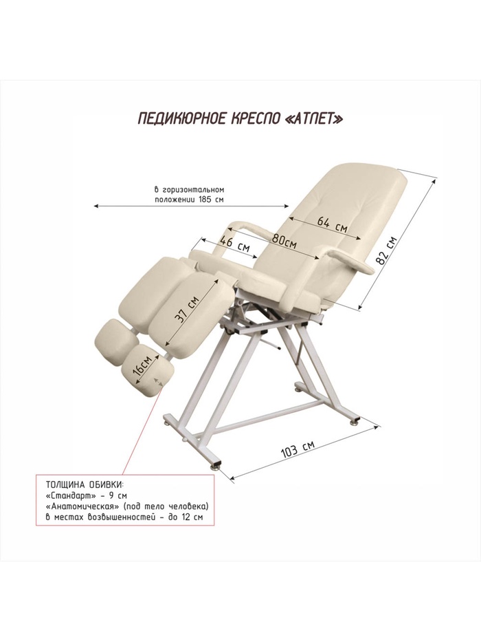 Покрытие не скользящая, высококачественная, износостойкая, «дышащая» экокожа производство Турции (50000 циклов, 100% РУ полиуретан). Ширина ложа 64 см, длина 185 см. Съемные подлокотники. Педикюрное кресло «Атлет»