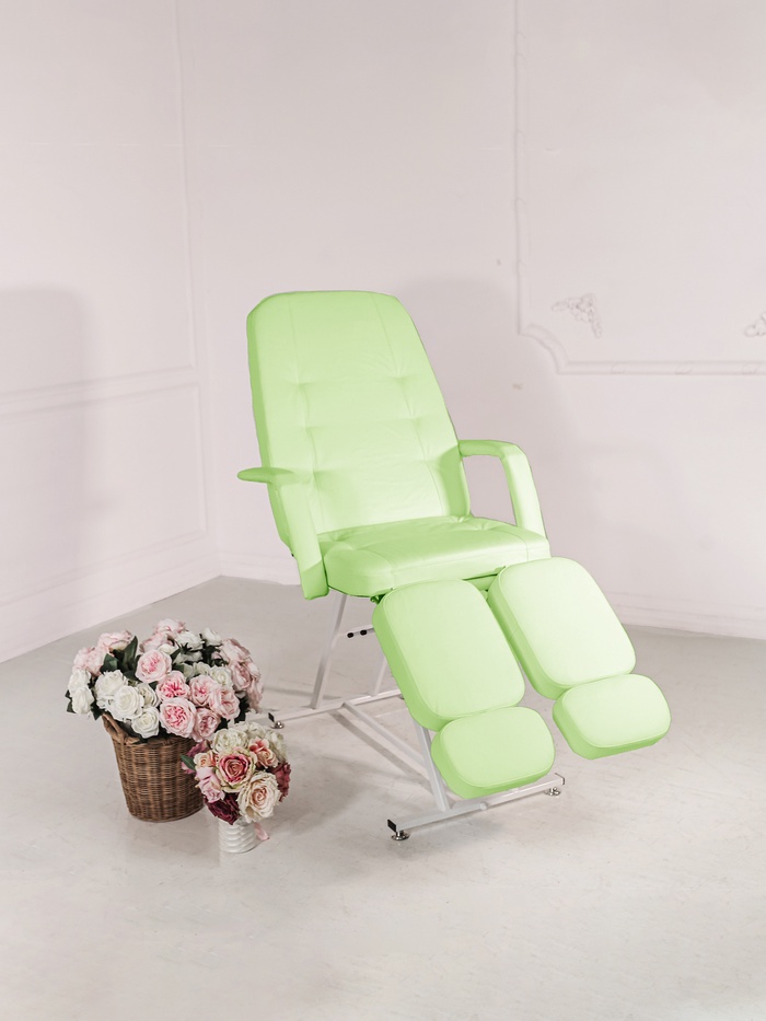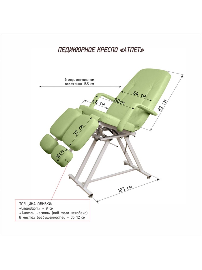 Покрытие не скользящая, высококачественная, износостойкая, «дышащая» экокожа производство Турции (50000 циклов, 100% РУ полиуретан). Ширина ложа 64 см, длина 185 см. Съемные подлокотники. Педикюрное кресло «Атлет»